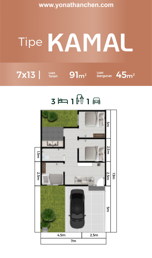 Kamal | 91 m² | 45 m² | 3 | 1 | 1 | Keluarga dengan anak, butuh ruang lebih luas |